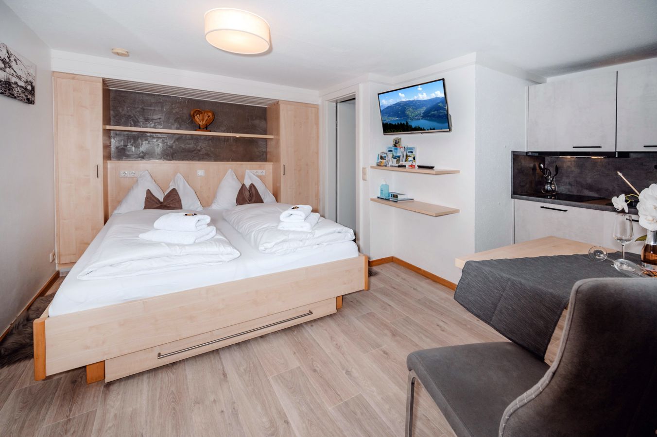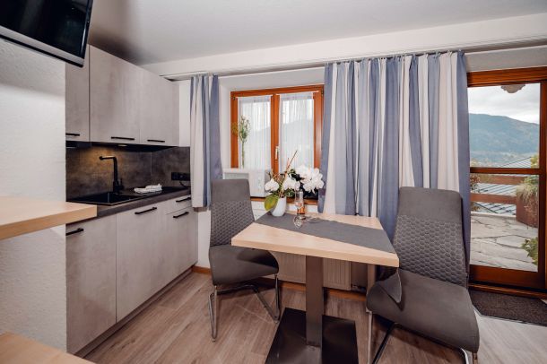 Gemütliches, kleines Einraumappartement,18m2, mit Terrasse und See-Panoramablick, extra Eingang beim Haus, 1 Wohnschlafraum mit Küchenzeile, 1Badezimmer (Dusche, WC, Fön) die Küchenzeile ist ausgestattet mit 2 Kochplatten, Kaffemaschine, Wasserkocher, Mikrowelle, Kühlschrank, Geschirr und Gläser)